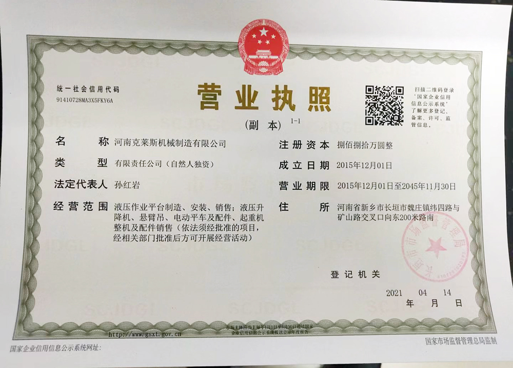 河南克萊斯機械制造有限公司位于河南省長垣市魏莊工業園區,公司注冊資金捌佰捌拾萬元整,在職員工40余名,擁有研發設計團隊,是一家生產液壓升降作業平臺及旋臂起重機生產銷售的廠家?! 」局饕a品有:固定導軌式液壓升降作業平臺、移動式液壓升降平臺、車載式液壓升降平臺;定柱式懸臂吊、墻壁吊、電動平車、登車橋等?! 【嫉脑O備,嚴格的管理是公司得以不斷發展壯大、產品能夠贏得用戶依賴的根本所在?!  熬_、...... <了解更多>